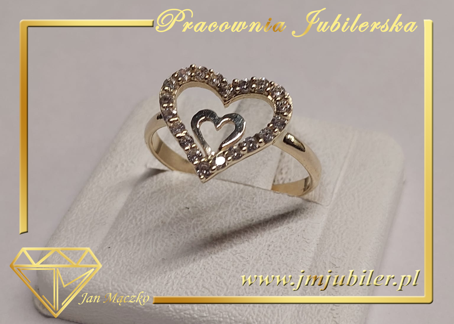 Pierścionek z żółtego złota, motyw serca z cyrkoniami. Cena 700zł.